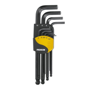 Zestaw profesjonalnych kluczy imbusowych PROXXONdo śrub sześciokątnych (HX), 9-częściowy. Z sześciokątną głowicą kulkową na długim ramieniu (krótkie ramię ścięte). W zestawie po sztuce: 1,5 – 2 – 2,5 – 3 – 4 – 5 – 6 – 8 i 10 mm. Wykonane ze stali chromowo – wanadowej, w praktycznym opakowaniu.