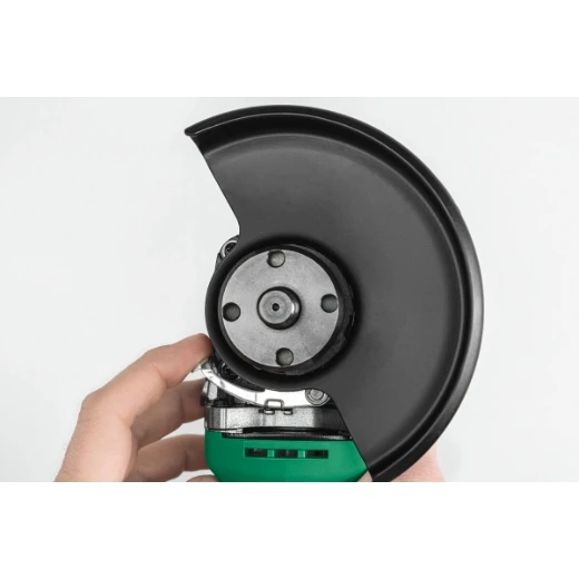 Szlifierka posiada beznarzędziową regulację osłony tarczy, blokadę wrzeciona oraz antywibracyjną rękojeść pomocniczą z trzema pozycjami montażu, co zwiększa komfort i bezpieczeństwo użytkowania.